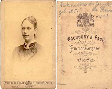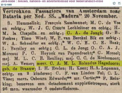 Kapitein M.C.E. Ruempol. Bron:www.nmm.nl Hieronder een kort overzicht van de brieven geschreven door zuster Marie en/of echtgenoot: Meester Cornelis 7 april 1873 , Poerwakarta 10 december 1873 , Batavia 11 mei 1874 , Padang 17 juni 1874 van Zwager Ruempol , Padang 18 augustus 1874 van Zwager Ruempol , Padang 25 augustus 1874 van Zwager Ruempol , Padang 18 september 1874 , Padang 18 november 1874 , Padang 18 november 1874 , Padang 18 december 1874 , Padang 26 februari 1875 , Padang 24 maart 1875 van Zwager Ruempol , Djokjakarta 7 februari 1876 van Zwager Ruempol , Djokjakarta 27 februari 1876 van Zwager Ruempol , Djokjakarta 27 mei 1877 van Zwager Ruempol , Djokjakarta 8 mei 1878 van Zwager Ruempol , Djokjakarta 26 augustus 1878 , Djokjakarta 13 september 1878 van Zwager Ruempol , Djokjakarta 22 september 1878 van Zwager Ruempol , ongedateerd . Hieronder een kort overzicht van de brieven geschreven door zuster Albertina en/of echtgenoot: -Batavia 9 februari 1874 van Zwager Heyliger , Breda 23 februari 1874 , -Batavia 10 maart 1874 van Zwager Heyliger - Brief d.d. Den Haag 11 december 1876. Albertine is verontwaardig dat broer Dirk zoo lang niet geschreven heeft. Ze vertelt dat haar vermogen recent een flinke knauw had door een vordering van de compagnon van haar overleden man, ze zal daarom kleiner moeten gaan wonen en dochter Marietje binnenkort van de kostschool moeten halen. -'s Hage 2 mei 1879 , 26 september ... , -Conrad 1 april ... - Brief d.d. Batavia 19 februari 1873 van nichtje Marietje. Vermoedelijk is het dochter Maria Albertina Jacoba (*circa 1864) van de advocaat Raymond Victor Heyliger(*1829) en Albertina de Brauw (*1845) een oudere zuster van Dirk destijds woonachtig in Batavia. Antoinette kwam in juli 1871 vanuit Nederland aan in Batavia en trouwt er op op 5 november 1873 met de aspirant civiel ingenieur Izaak (Ies) Rolandus Hagedoorn (1844-1875). Izaak was de oudste zoon uit het gezin Rolandus Hagedoorn - de Brauw (Mama Petronella de Brauw was verre familie van Antoinette). Hij was opgeleid tot zeeofficier waar hij het tot luitenant 1ste klasse bracht en maakte toen een overstap naar ingenieur bij openbare werken waar hij in 1870 een positie als aspirant ingenieur in Banka kreeg. Daarna volgde in 1873 overplaatsing als ingenieur 3de kl. naar Poerwakarta. Bij zijn taak als ingenieur hoorde ook zitting te hebben in de lokale schoolcommisie en een taak als landmeter. Op 29 juli 1874 beviel Antoinette voortijdig van een meisje genoemd Petronella Jacoba (Nelly) die al in oktober dat jaar stierf. Izaak werd eind 1874 (na oktober) overgeplaatst naar Tjiandjoer en in januari 1875 bevorderd tot ingenieur 2de klasse. ![]() Op 31 juli van dat jaar overleed hij aan een hartkwaal. Antoinette beviel een week daarna van een dochter genoemd Antoinette Maria Elisabeth (Betsy of Nonnie genoemd). Na het overlijden van Izaak logeerde zij respectievelijk bij de assistent resident van Tjiandjoer, de familie van Hoofdingenieur Mansvelt te Bandoeng en vanaf midden 1876 bij haar zuster Marie Ruempol-de Brauw te Djokjakarta. In januari 1877 vertrok zij via Semarang naar Batavia om eind maart naar Nederland te vertrekken met het clipperfregat Noach III waar zij in augustus aankwam. Begin januari 1878 overleed dochterje Betsy die in Amersfoort werd begraven. Mogelijk verbleef zij toen bij het gezin van zwager Chris Rolandus Hagedoorn die daar als officier van gezondheid gelegerd was. Later in 1879 verblijft zij in Ginneken bij Breda bij oom en tante de Brauw. In 1880, zij was toen net 28, keert zij terug naar Indië met het stoomschip Madura. Aan boord ontmoet ze de 2de luitenant overgrootvader Alex de Jongh met wie zij een jaar later in het huwelijk treed. ![]() De clipper Noach serie waarmee Antoinette in 1877 naar Nederland terugkeerde. Advertentie van haar vertrek naar Indië eind 1880.