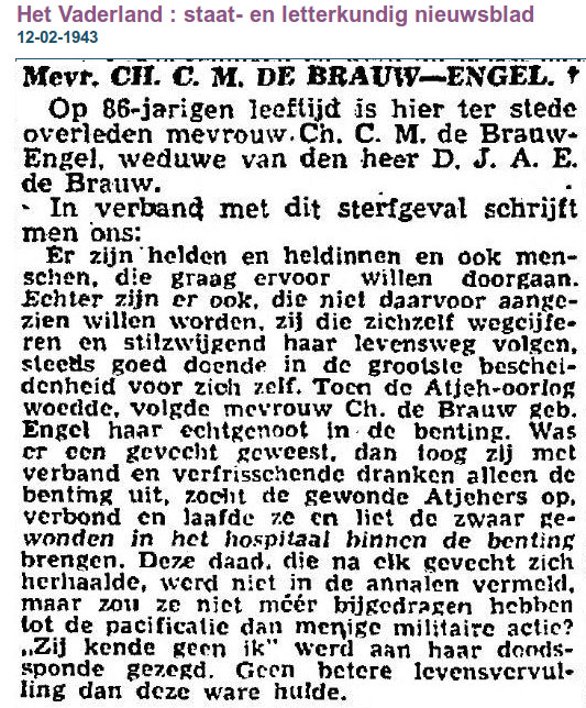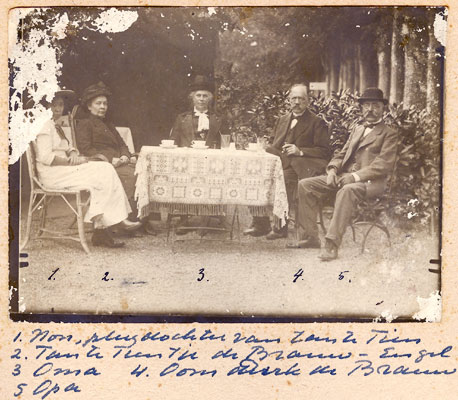 Links een foto van het echtpaar de Brauw met zijn zuster Antoinette en zwager C.A. de Jongh plus een pleegdochter (Non) van Tientje . Het onderschrift is van mijn oom Rob de Jongh. Op 26 februari 1914 overleed Dirk, 65 jaar oud, in Den Haag. In 1916 werd het land Bedojo voor ongeveer Fl 360.000 verkocht aan de koloniale bank. Die verkoop zal te maken hebben met het overlijden van de moeder van Tientje de weduwe M.A. Engel - Baumgarten in dat jaar. In juni 1915 trekt Tientjes zuster Helena met echtgenoot Haro H.W. Rengers Hora Siccama en hun vier kinderen bij haar in. Hun dochter Helene trouwt in 1918 met Dirk de Jongh een neef van haar overleden man zoon van mijn overgrootouders Alex de Jongh en Antoinette de Brauw. Het waren hun ongetrouwde dochters die er als laatste van de familie tot begin 21st eeuw woonden samen met nichten van de familie Rengers Hora Siccama naar ik meen. Tientje bezocht Indië weer in de periode 1919-1921 en 192. - 1930. Zij overleed in februari 1943, 86 jaar oud in Den Haag. Bovenstaand artikel uit het Vaderland toont aan wat een bijzondere vrouw het was. Over de Brieven (Indien getrancribeerd is de eerst zin blauw en dan clickbaar.) Eerste periode van juni 1859 tot kort na het overlijden van zijn ouders februari 1862 in Padang (Sumatra). Hieronder een kort overzicht van de brieven geschreven door zijn ouders uit Utrecht tenzij ander aangegeven: Pijrmont 21 juni 1859 van Vader , 8 december 1859 van Vader en moeder naar 's Hertogenbosch , 14 december 1859 21 december 1859 van Vader naar 's Hertogenbosch , 8 januari 1860 van Vader en moeder naar 's Hertogenbosch , 15 januari 1860 van Vader en moeder naar 's Hertogenbosch , 22 januari 1860 naar 's Hertogenbosch , Nieuwe Diep 24 januari 1860 van Vader , 29 januari 1860 , 5 februari 1860 naar 's Hertogenbosch, , 27 februari 1860 naar 's Hertogenbosch, 11 maart 1860 naar 's Hertogenbosch , 30 maart 1860 , ongedateerd naar 's Hertogenbosch , ongedateerd naar 's Hertogenbosch , 16 april 1860 naar Bois le Duc, 27 juni 1860 naar Bois le Duc , Samarang 2 juli 1860 van Vader naar Bois le Duc , Amsterdam 14 augustus 1860, 19 augustus 1860, 11 september 1860, 7 oktober 1860 , 16 november 1860, 28 november 1860 naar Bois le Duc, 4 december 1860 , 17 december 1860 naar Bois le Duc , 28 december 1860 , 6 januari 1861 , 30 januari 1861 , 9 februari 1861 , 18 februari 1861 , 26 februari 1861 , 11 maart 1861 A/b Vriendschap Hellevoetsluis 26 april 1861 van Moeder en zusters Albertine en Marie ,ongedateerd naar , Bois le Duc , Samarang 24 juni 1861 van Vader naar Bois le Duc, 's Hertogenbosch of elders , Batavia 20 augustus 1861 , Padang 22 september 1861 van Vader en moeder naar Weesp ,Paija 16 oktober 1861 , Paija combe 22 november 1861 van Vader en moeder , Padang 27 januari 1862 , ongedateerd , ongedateerd , ongedateerd , ongedateerd , ongedateerd van Vader , ongedateerd van Vader en moeder naar Weesp. Dan volgen twee brieven niet al te lang na het overlijden te weten : Een brief gedateerd 31 december 1862 van Broer Frans [???] uit Padang en een brief van augustus 1863 van zijn grootma [??? Merkwaardig omdat beiden grootmoeders dan al overleden zijn althans volgens mijn gegevens]. Tweede periode van 1871 tot en met 1891 van de volgende personen ![]()