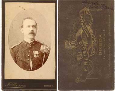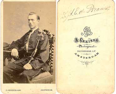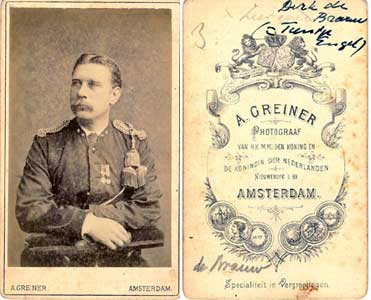 Zes jaar later in maart 1872 vertrekt Dirk als 2de luitenant Infanterie naar Indië waar hij wordt geplaatst in het 12de bataljon infanterie. In maart 1873 neemt hij deel aan de eerste expeditie naar Atjeh onder leiding van Generaal-majoor Köhler. In 1873 begon deze Atjeh oorlog met doel het Nederlands gezag aldaar te vestigen voordat andere landen dat deden. Men meende dat door verovering van de Kraton in een eerste expeditie later dat jaar de oorlog gewonnen was. Niets bleek minder waar. Dirk geraakte door een niet bekend reden in een hospitaal in Padang en kwam in maart 1874 weer terug naar Batavia. Zijn inscheping voor de 2de Atjeh expeditie zou op 20 november van dat plaats vinden. in juni 1876 werd Dirk bevorderd tot 1ste luitenant In 1878 word gemeld dat hij gewond is geraakt bij de bestorming van de versterking Lamkrah in Atjeh door een (klein kaliber) kogel in zijn long waarna hij naar Batavia werd vervoerd om te herstellen. Op 30 juni 1879 trouwde hij met Tientje (Christine Cornelia Maria) Engel (1856-1943) uit Djojakarta dochter van de planter Henkdrikus B.F. en Maria A. Baumgarten Dirk en Tientje gemaakt tijdens verlof in Nederland in de periode 1884-1886. (hij circa 36 en zij 28 jaar) In september 1883 werd hij benoemd tot kapitein en in 1893 ging hij circa 45 jaar in dezelfde functie met militair pensioen. bovenstaande foto is mogelijk gemaakt tijdens een bezoek aan Nederland na zijn pensionering Op 27-05-1896 komt Dirk voor in een Indische krant als contactpersoon in de boedel van J.C. Baumgarten, een overleden oom van zijn vrouw. Vanaf 1899 word hij genoemd als administrateur van de cultuurmaatschappij van zijn schoonfamilie, Bedojo (Bedoijo) nabij Djokjakarta in het regentschap Kalassen gelegen aan de voet van de vulkaan Merapi, met zijn schoonmoeder als ondernemer. Producten Indigo en rijst. In 1905 word hij directeur (ondernemer en administrateur) van een nieuw opgerichte cultuurmaatschappij Merapi gevestigd te Djocjakarta waarvan fl 39.000 van het startkapitaal van fl 40.000 afkomstig was van zijn schoonmoeder voor haar inbreng van de onderneming Bedojo met als commissarissen zijn zwager Richard C. Engel en A.H Engel, een mij onbekend familielid . Zijn schoonmoeder samen met een groot aantal familieleden inclusief genoemde A.H. Engel, schoonzus Helena Rengers Hora Siccama geb. Engel worden sinds 1907 genoemd als ondernemers van Kenaroean (indigo en suikerriet) met zwager Melchior L. Engel als administrateur. Deel parenteel familie van Tientje de Brauw - Engel.