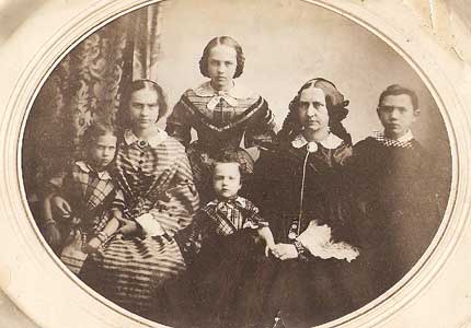 .![]() Boven links:Moeder de Brauw - van Heemskerk van Beest met haar kinderen. (Bron: FA Krol) De foto is genomen van een ingelijst origineel. Gezien de leeftijd van de kinderen en de kleding moet het tijdens het verlof van de familie gemaakt zijn. Mijn vermoeden is dat het aan vader C.A. de Brauw als verrassing is meegegeven toen hij in februari 1860 naar Indië terugkeerde als herinnering aan zijn voorlopig in Nederland achtergebleven gezin. De globale leeftijd van de kinderen in 1860 was Marie 16 (links naast Antoinette ?) . Albertine 15 (midden achter ?), Dirk 12 (rechts) naast moeder, Antoinette 8 (links) en Albert 5 jaar (midden). Tijdens het verlof werd Dirk in de zomer van 1859 (11 jaar oud) op een internaat in 's Hertogenbos geplaatst, in de zomer van 1861 naar een school in Weesp en mid 1866 aangenomen als kadet bij de militaire academie.
