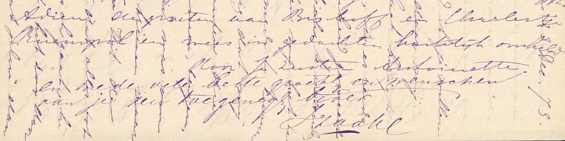 blz. 1/4 (R) 01 Batavia 8 april 1873 02 Lieve Dirk, Het speet Marie en mij ver- schrikkelijk dat wij ons door 05 het dichte weder hadden laten afschrikken om je dien ochtend nog eens te zien. Het was dan ook een verschrikkelijk vuil weertje hier op Meester [Cornelis] dien 10 dag en wij dachten verkeerlijk dat het beneden even hard geregend had en dat toen dus ook niet gaan zouden. Acht dagen waren wij erg verheugd 15 over de tijding dat de sultan van Atjeh alle voorwaarden die den heer Nieuwenhuisen gesteld had aangenomen had. Dinsdag ben ik dus avonds met Jeanette en appendix 20 naar de Danly['s] geweest. Het was mevrouws verjaardag. Jeanette souffleerde die dag aan een weinig blz. 2/4 (b L) 01 hoofdpijn en ging vroeg naar huis maar Marie v[an] 't Hoff vond het zoo naar voor mij dat ik toen ook weg moest. Natuurlijk dat zij het 05 aan mevrouw van Danly is gaan vertellen en die wilde volstrekt niet hebben dat ik zoo vroeg naar huis ging. Vroeg mij toen of ik dien nacht daar door wilde brengen dat ik dan 10 ook gedaan heb en den volgenden ochtend ben ik weer naar huis ge- marcheerd. Maar onze vreugde was van korten duur daar wij donderdag 's hoorden er een telegram 15 was aangekomen die melde dat de oorlog verklaard was en de m[a]rine. reeds bombardeerde maar dat de s hopen [schepen ??] goddank in goede orde en alles wel aan boord waren aange- 20 komen. Ik denk dat jelui wel reeds. slaags zullen geweest zijn. Wees toch vooral voorzichtig hoor beste jongen denk er aan dat wij allen met blz. 3/4 (b R) 01 groot verlangen naar je thuis- komst uit zien. Ik hoop maar dat dese oorlog niet van lange duur zal zijn en dat je weer gezond terug kan komen. Dan verbeelt eens hoe plezierig het zijn zal daar het 12de [ba]taillon .. .. Meester [Cornelis] geplaatst zal worden in plaats van het elfde dus hebben wij je digt bij ons met deze .. sturen wij je ook een kistje inhoudende wat sambal en een flesch mulicaloumi[?] of wel gelei van kerriekruiden. Ge moet er als je soep eet een thee- lepeltje in doen en dan hebt ge heerlijke kerriesoep. je moet ook wat aan Bischoff van die mulicaloumi[?] Ik hoop dat je ons spoedig zult schrijven en ons dan eens vertellen wat of ge zoo al gaarne had en indien het ons mogelijk is zullen wij het voor je maken of zien te krijgen. Veel nieuws is er niet te blz. 4/4 (L) 01 vertellen. Isaak Hagedoorn heeft geknokkeld maar is weer beter. De Nijs g[aat] di[nsdag] 16 trouwen. Heyliger is erg ziek. Marie zegt dat hij ene operatie moet ondergaan met welke ... dat weet ik niet Nu beste Dirk mijn hartelijke groeten aan Bischoff en ontvang een heleboel zoenen van je zus Antoinette![]()