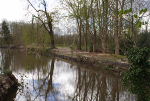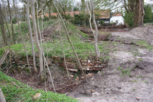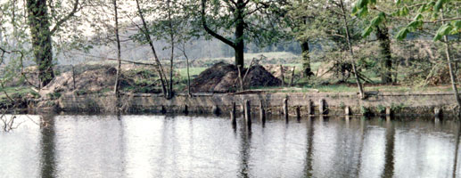 Kademuur en 1ste wijerd. Hier ongeveer bevond zich het oorspronkelijke woonhuis; Zicht richting stuwwerk (Foto 2007)